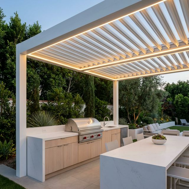 Bespoke outdoor kitchen and lounging area with integrated louvered shade.
